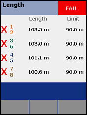 Если же самая короткая пара выйдет за пределы 90 м + допуск 10%, то прибор покажет результат FAIL. Так и произошло в случае, который иллюстрирует картинка слева.